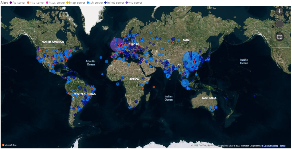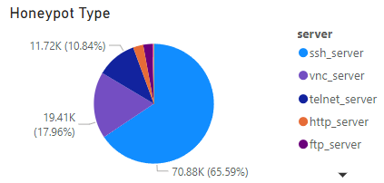 SSH was the most targeted service, encompassing 65.59% (70.88k) of all traffic. This was followed by VNC at 17.96% (19.41k) and Telnet at 10.84% (11.72k).
