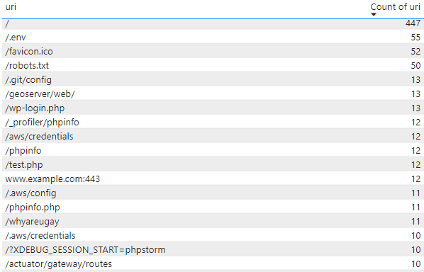 For HTTP and HTTPS connections, the most requested URI was ‘/’ with 447 requests. This was followed by /.env and /favicon.ico, at 55 and 52 requests respectively.
