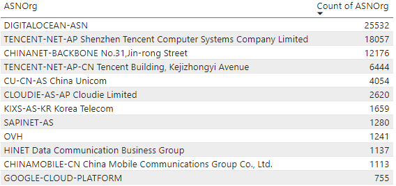 Digital Ocean, Tencent Net AP Shenzhen, and ChinaNet Backbone were the top 3 ASNs identified. Combined, they made up approximately 52% of all traffic.
