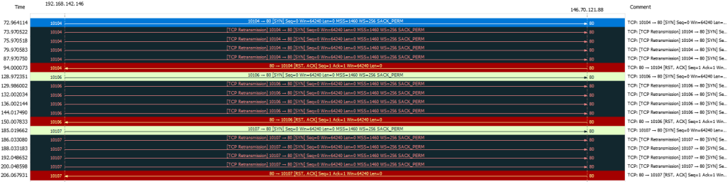 The sample I had also reached out to several CDNs and in particular to one address already flagged in VirusTotal. However, not much came from those connections. It appears that the address isn’t online anymore. Still, we can see the general exfiltration process that would occur. The compromised host would likely forward data to the C2 over port 80/tcp.