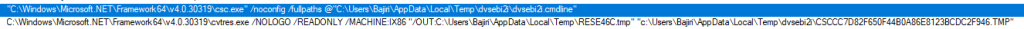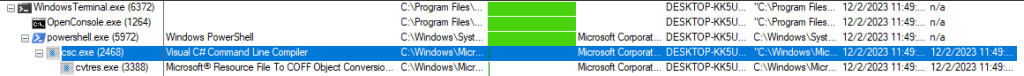 I say probably because I am by no means an expert, just a person who can google with the best of them. That being said, we can also see the commandline property of these processes and see that they follow this example on building and executing C# code in memory. (It might be a little fuzzy, but trust me when I say it’s practically the same)