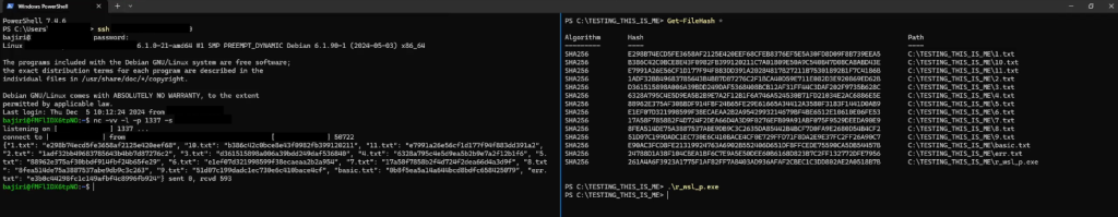This went through successfully, with no detections or alerts. A testing directory was created in the C drive, and it was populated with a series of random files with random data. They were all encrypted and the TCP connection was successful at sending out the data.