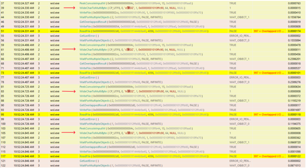 The primary issue with this monitoring type is that it only works for hands-on keyboard sessions, I.e., if I am actually typing commands into the session. Note: We can also monitor RtlUnicodeToUTF8N calls in KERNELBASE.dll, but this dll is noisier than wsl.exe, so it can be a little more annoying to do it this way.