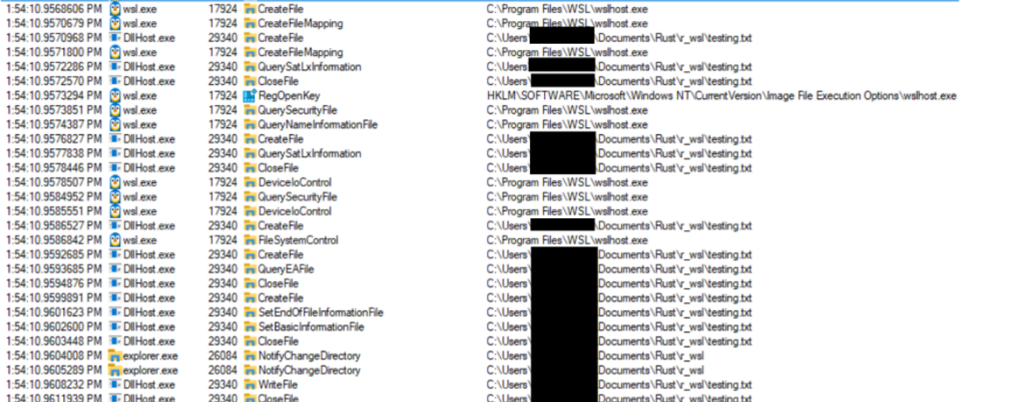 For sessions executed programmatically, we have to rely on other forms of monitoring. One approach is to observe all events on the host device and *auto-magically* associate them to the WSL process. For instance, following events in procmon after executing touch testing.txt shows the file creation event.