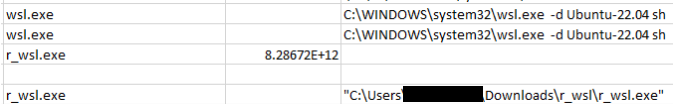 Security solutions will only see the passed command line "sh". E.g., wsl.exe Ubuntu-22.04 sh