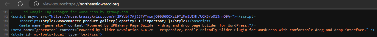 | hxxps[://]ecowaterminnesota[.]com/wp-content/cache/min/1/9659650c81ce1b984c58[.]js?ver=1709046791 | Self-link to a hosted JavaScript file. Contains a function that loads a specified JavaScript source file and returns the element. | Embedded in a viewport element that covers the current screen. |