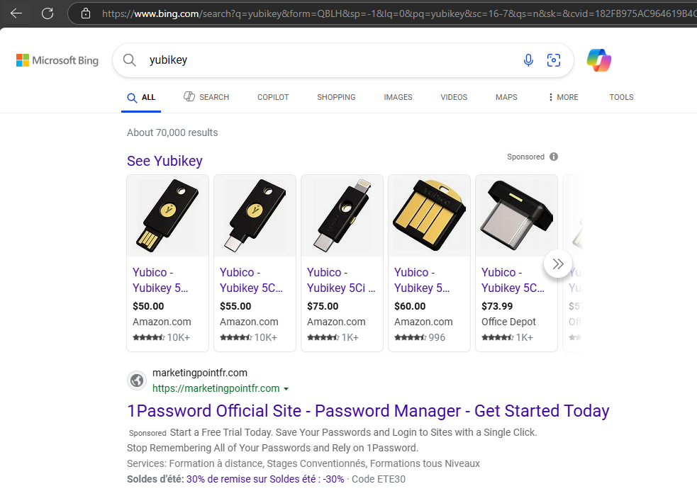 The user initially performed a Bing search for the string ‘yubikey’.